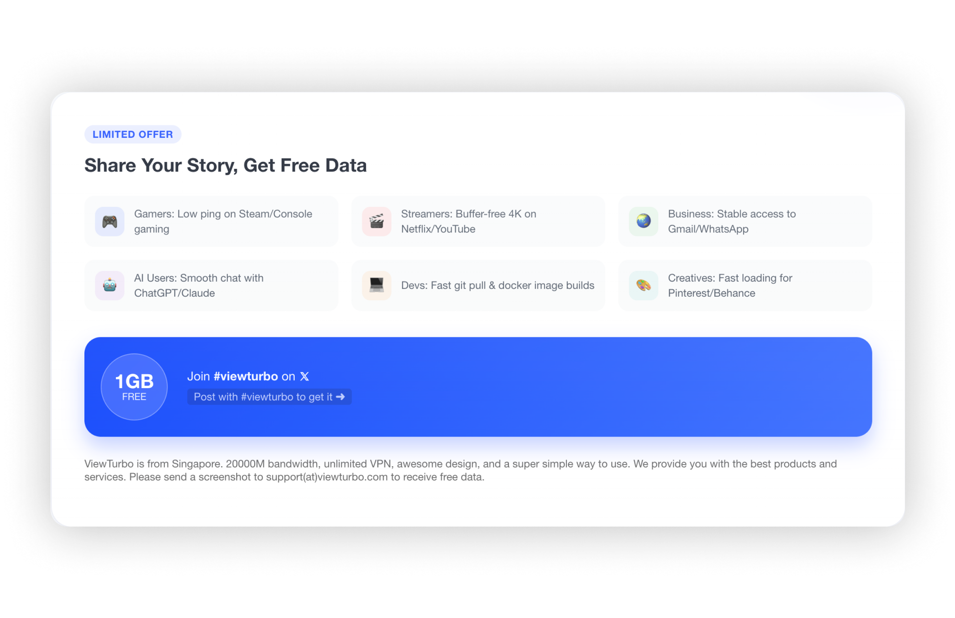 - Social Sharing Reward (Homepage) Publish a post with images or a video review about ViewTurbo on any social media platform to receive 1GB of data. (Note: Please contact customer service after posting to claim your reward.)