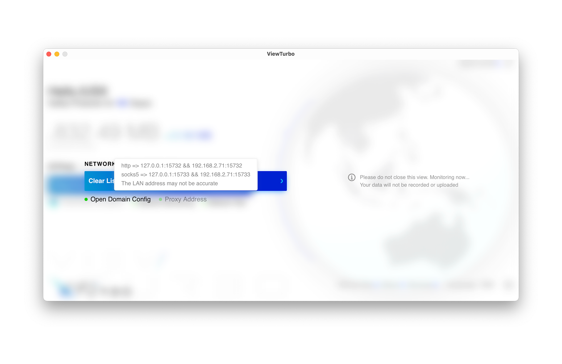 You need to start ViewTurbo and click Network Monitoring -> Proxy Address, where you’ll see the HTTP and SOCKS5 addresses, along with the current network IP.